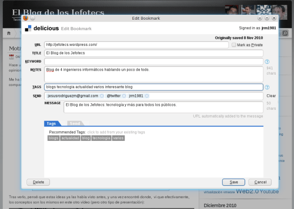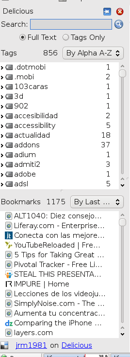 Utilizo el navegador Firefox principalmente por este complemento (de no ser por él, seguramente en el Mac tiraría más de Safari, y Chromium en GNU/Linux ó Chrome en Windows), es el más completo para Delicious de los que he probado. Esto es lo que añade en tu navegador: