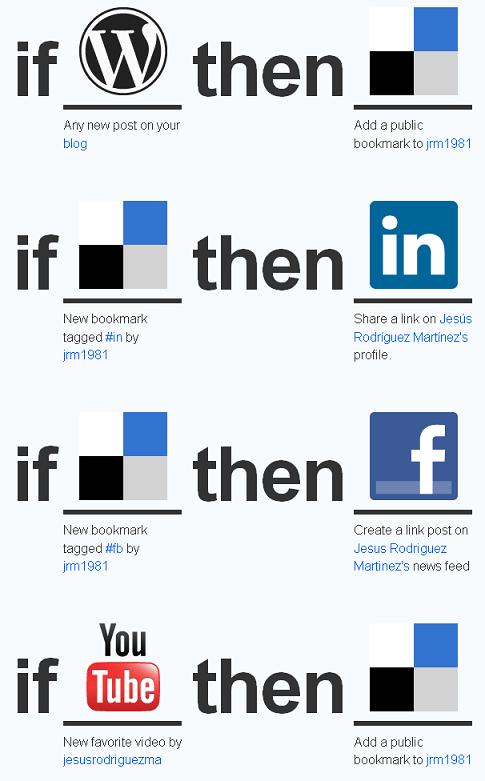 Sin duda If This Then That («Como conectar (aún más) tus perfiles sociales: ifttt.com«, «Compartiendo mis links de Delicious a través de ifttt«) es uno de mis servicios favoritos de Internet, sus automatizaciones me ahorran un montón de trabajo para mantener mis enlaces o fotografías (por ejemplo) controlados.