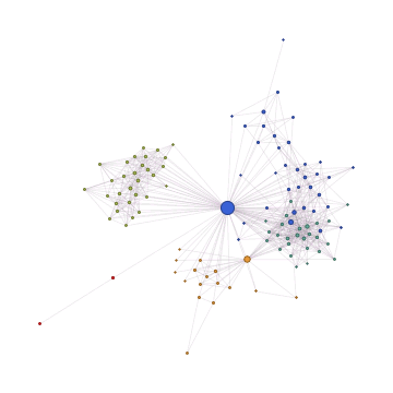 A modo de comparación, voy a poneros mis grafos de contactos de Facebook, y de LinkedIn (hace un tiempo os escribí sobre la aplicación InMaps de LinkedIn, que nos permite generar estos gráficos) :