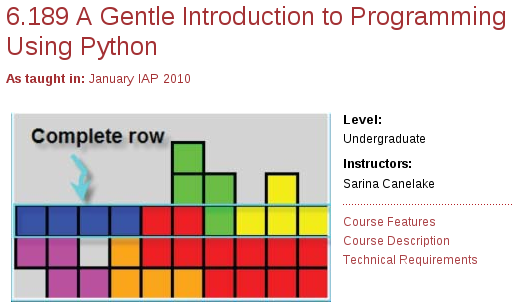 Primero podemos echar un vistazo en los cursos disponibles para los estudios «Electrical Engineering and Computer Science«. Dentro de estos estudios, vemos que el curso «6.189 A Gentle Introduction to Programming Using Python» es lo que estábamos buscando (en la descripción, vemos que se trata de un curso de apoyo para las clases de «6.01 Introduction to Electrical Engineering and Computer Science I«).